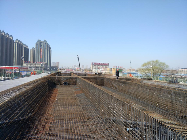 目前施工已大面積展開(kāi),截止到3月6日,綜合管廊支護開(kāi)挖累計完成750米,主體結構澆筑完成460米;高架橋箱梁累計完成兩聯(lián),70聯(lián)鋼筋綁扎已完成,74聯(lián)箱梁支架正在搭設。